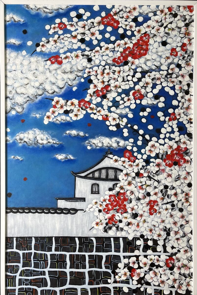 Oil on canvas in a black wooden frame. One of my earlier series of Japanese style paintings. The sakura is in white and red flower blossom and falling petals in the same time over the Temple. The passing and the permanent things in our present life, the beautiful moment of contemplation.