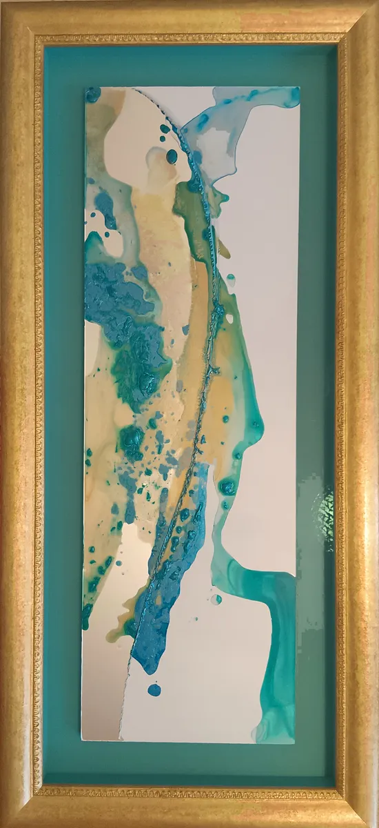 Sold (Hamburg) Metallic tempera and metallic acrylic paint on partially torn-off KAPA Fix board, teal passpartout cardboard, gilded wooden frame by boesner Düsseldorf, 99 art glass